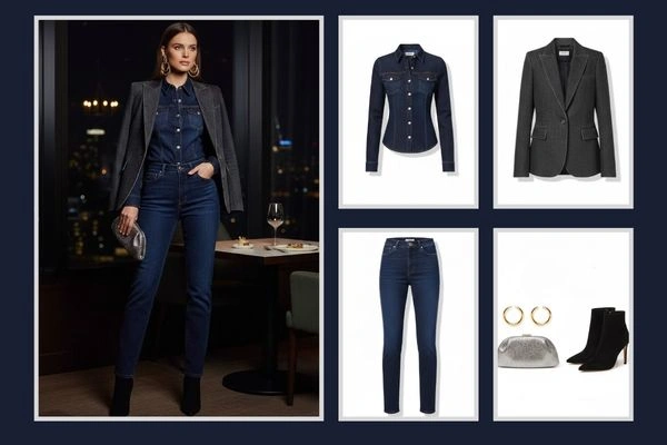 Denim on denim can be dressed up for evening events or dinners. Start with a fitted denim shirt tucked into highβrise straight jeans. Layer with a tailored denim blazer or jacket in a contrasting wash. Add heels or stylish boots, bold earrings, and a clutch bag. Choosing sleek, dark denim pieces helps elevate the feel and gives it a modern, upscale edge.
